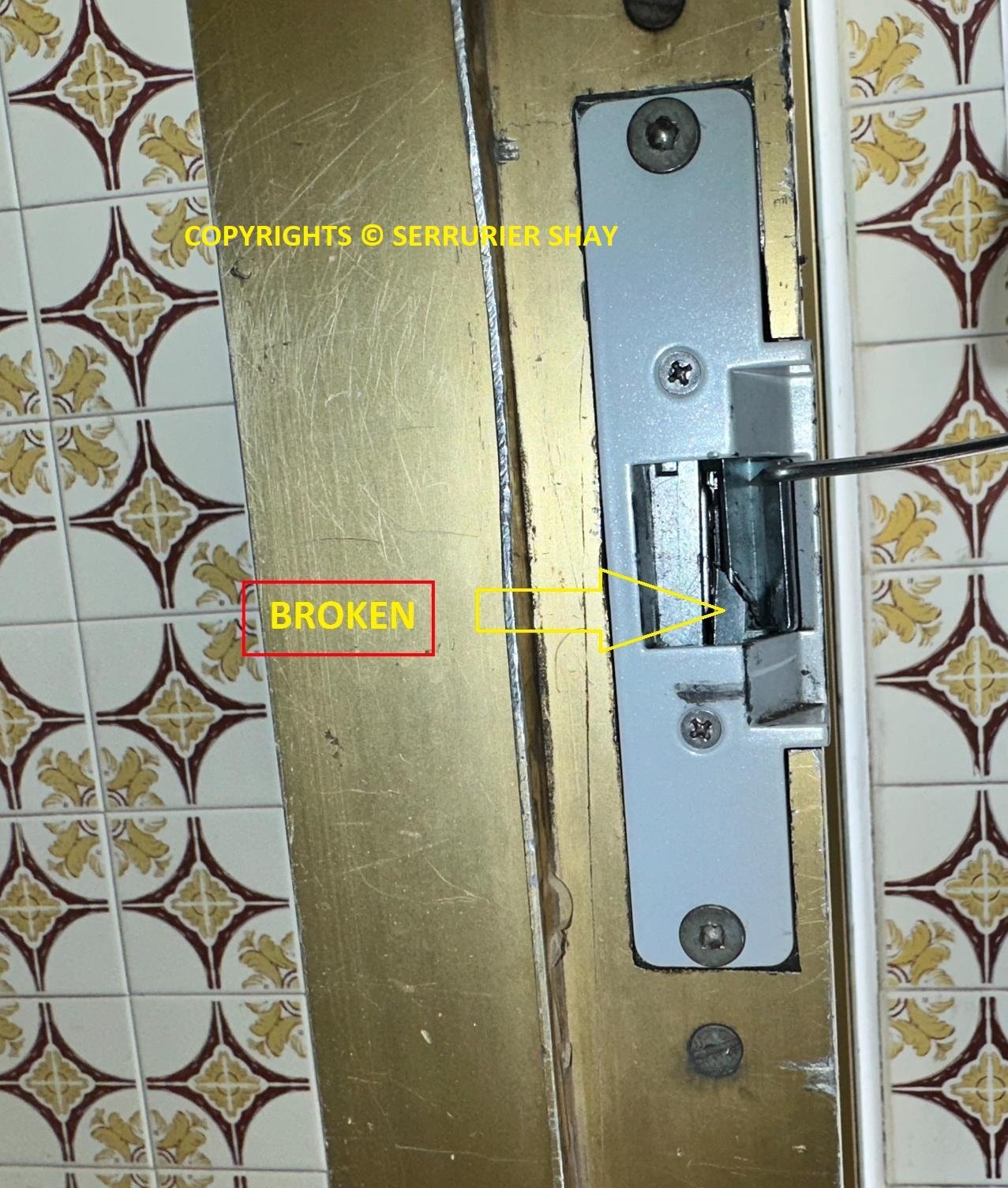 Le loquet (lèvre) de la gâche casse, comme on le voit souvent après une effraction.