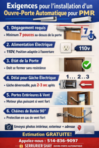 L’installation d’un ouvre-porte automatique (handicap) nécessite certaines conditions techniques afin d’assurer la sécurité, la fiabilité et un résultat propre et esthétique. Veuillez lire attentivement les exigences ci-dessous avant de demander une installation.